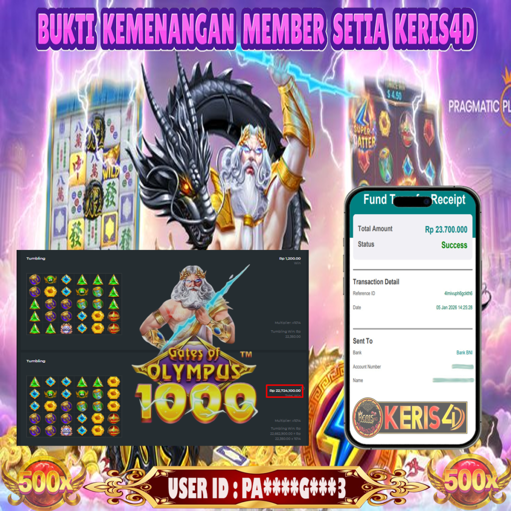 KERIS4D dikenal sebagai situs terpercaya yang selalu menghadirkan pengalaman bermain slot online yang aman, fair, dan berlisensi resmi. Di sini, kami tidak hanya sekadar memberikan janji, tapi bukti nyata berupa slip kemenangan yang dapat Anda lihat secara langsung.